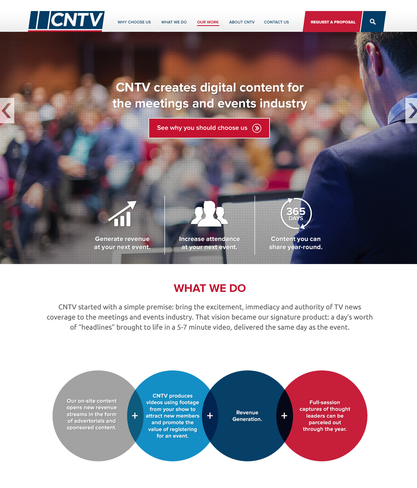 Convention News Television helps bring excitement, immediacy and authority of TV news coverage to the meetings and events industry. Unlike audio-video production companies that require up to weeks of time to produce videos for customers, CNTV only requires a third of the time. Additionally, they help make their clients money by giving them new revenue streams via video content. I helped them simplify their look and make it more digestible to newer customers. The end result is a more streamlined and modern brand that speaks to their potential customers.